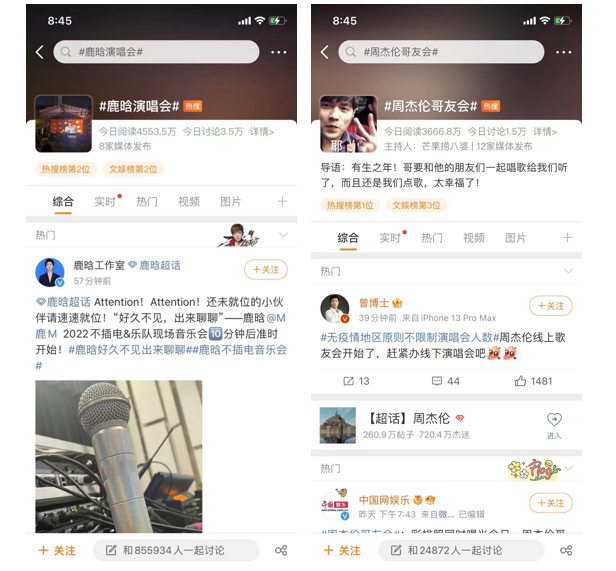 11月19日晚8点,“鹿晗演唱会”词条登顶微博热搜第一,讨论量达到2万。屈居第二的“周杰伦哥友会”讨论量只有8000。很多网友在微博发问,“周杰伦在哪个平台直播?”