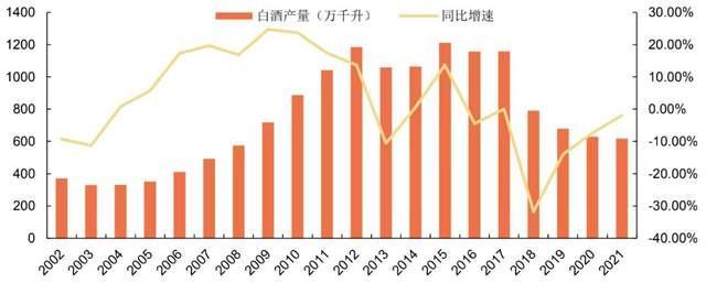 根据国家统计局数据显示,2004-2012年我国白酒产量逐渐增长,由331.28万千升增至1184.9万千升,然而在2015年达到峰值之后开始出现了明显的下降趋势。