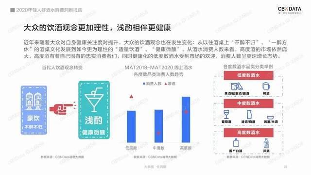 对于年轻人来说,他们的饮酒理念更加理性。随着对自身健康关注度的提升,饮酒观念逐渐从“不醉不归”“一醉方休”变成了“适量饮酒”“健康微醺”,在此需求之下低度酒成为了年轻人的选择。