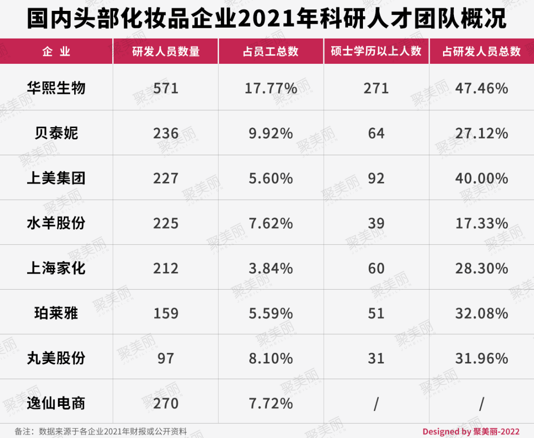 可以看到,国内头部企业的研发人员基本都在200人以上,占员工总数的5-10%左右。与此同时,企业也十分重视高学历人才的引进,其中,华熙生物、上美集团硕士学历以上占研发人员总数都超过了40%。