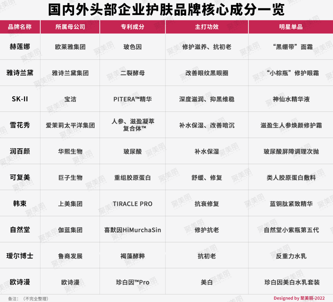 除了国际集团我们所熟知的SK-II的半乳糖酵母样菌发酵产物PITERA、欧莱雅的玻色因等专利成分之外,也有不少本土头部企业推出了自研专利成分。