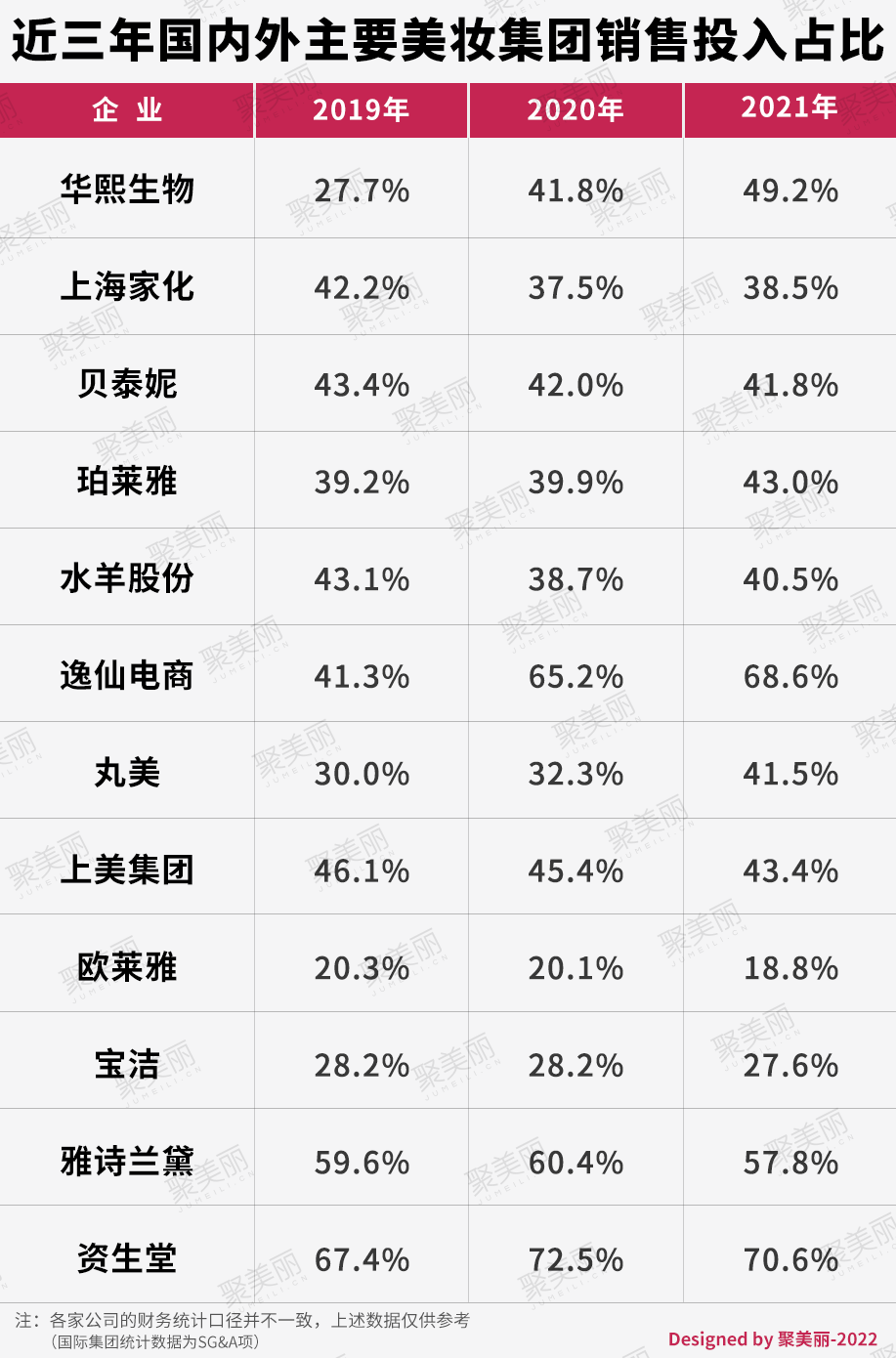 对比国内几家知名化妆品上市公司,可以发现化妆品是典型的高毛利、高费用率行业,SG&A(Selling, General and Administrative Expenses,销售、一般和管理费用)费用率一般在40%-70%。