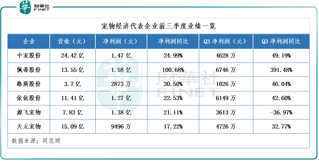 中宠股份(002891.SZ)作为一家比较纯正的宠物食品公司,前三季度该公司营收24.42亿元,同比上升21.38%;归母净利润1.15亿元,同比上升24.99%。