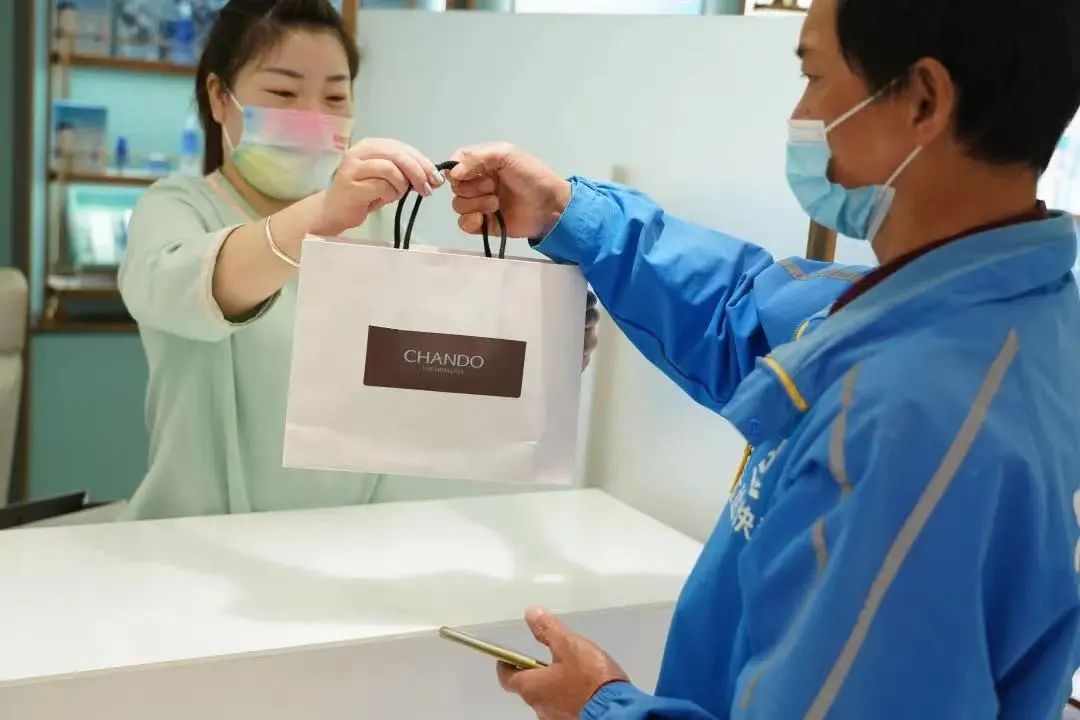 图:达达快递员在自然堂门店取货(图源:自然堂)