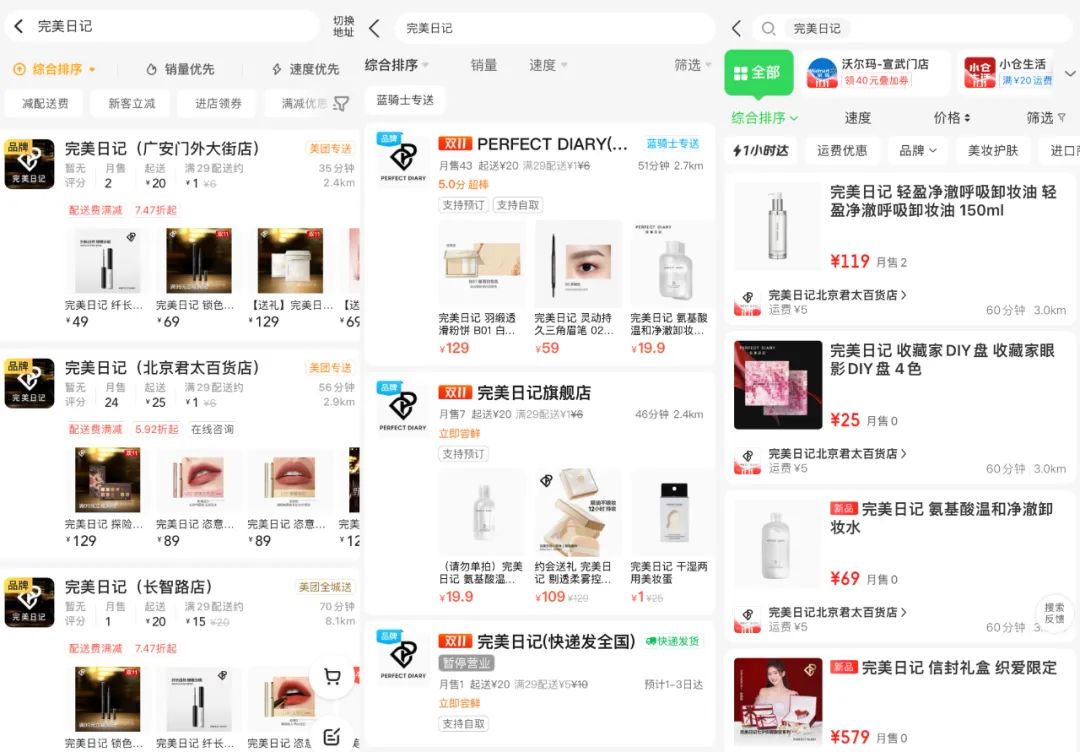 图:完美日记在美团、饿了么、京东到家三大平台入驻情况截图