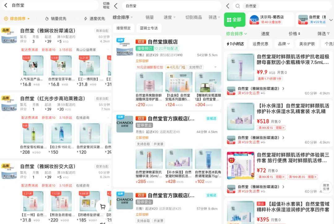 图:自然堂在美团、饿了么、京东到家三大平台入驻情况截图