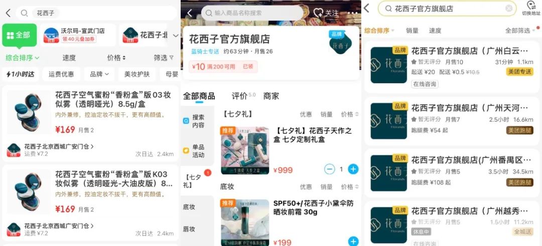 图:花西子在京东到家、饿了么、美团三大平台入驻情况截图