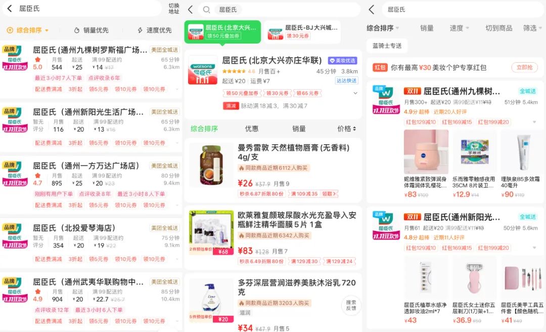 图:屈臣氏在美团、京东到家、饿了么三大平台入驻情况截图
