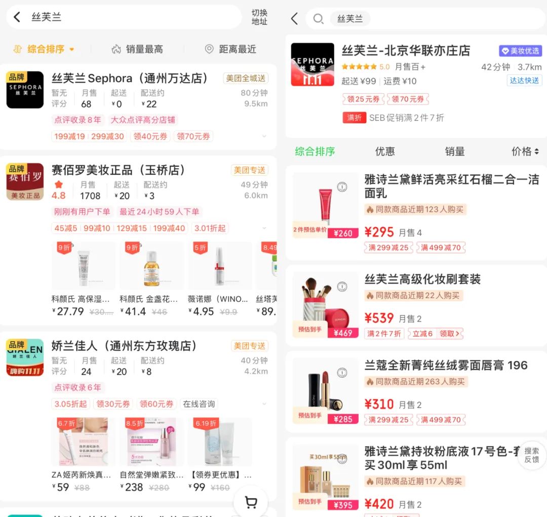图:丝芙兰在美团、京东到家平台入驻情况截图