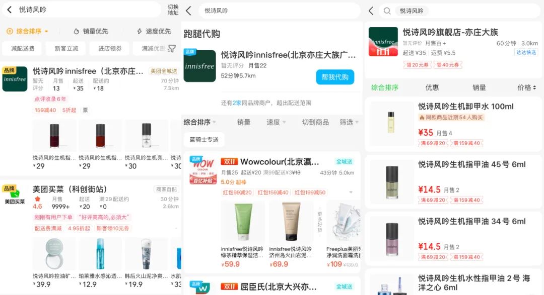 近年来因为销售下滑、关店等,一直处于风口浪尖的韩国品牌悦诗风吟,也如上述国内品牌做到了“雨露均沾”:2020年6月入驻饿了么;同年12月与京东到家合作;2021年携手美团。