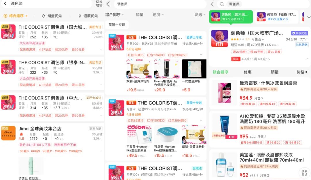 图:调色师在美团、饿了么、京东到家三大平台入驻情况截图