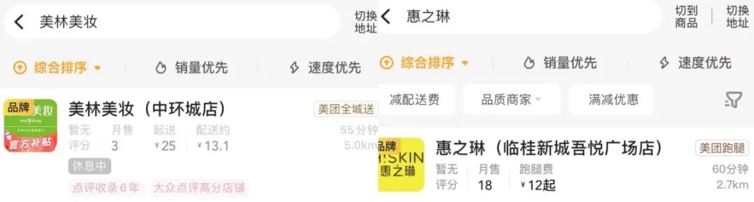 图:美林美妆/惠之琳在美团入驻情况截图