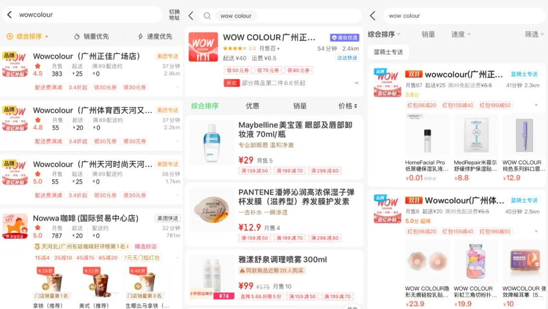 图:WOW COLOUR在美团、饿了么、京东到家三大平台入驻情况截图