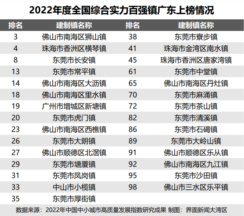 新一轮全国百强镇名单证明了广东是镇域经济不折不扣的“头号玩家”。11月18日,中国中小城市发展指数研究课题组、国信中小城市指数研究院发布《2022年中国中小城市高质量发展指数研究成果》,其中包括2022年度全国综合实力千强镇前100强等榜单。