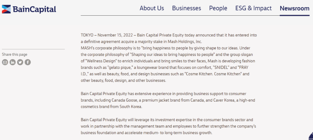 最新一笔出自贝恩资本——日本时尚和生活方式集团 Mash Holdings(简称 “Mash”)正式宣布被私募股权投资公司贝恩资本(Bain Capital)收购多数股权。据预测,这一笔超级并购金额达到近2000亿日元(约合人民币100亿元)。