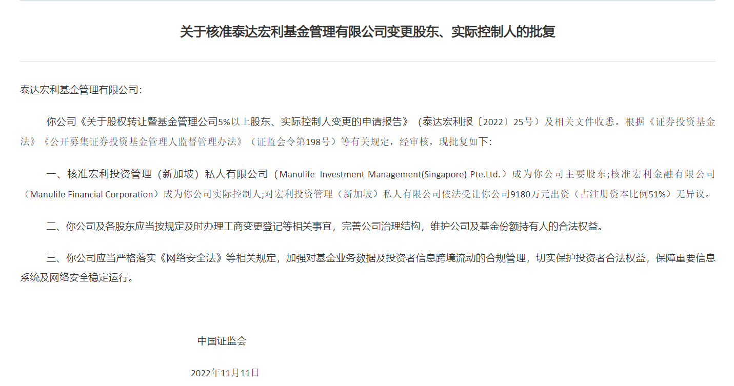 公告显示,11月11日,证监会核准宏利投资管理(新加坡)私人有限公司(Manulife Investment Management(Singapore) Pte.Ltd.)成为泰达宏利基金主要股东;核准宏利金融有限公司(Manulife Financial Corporation)成为泰达宏利基金实际控制人;对宏利投资管理(新加坡)私人有限公司依法受让泰达宏利基金9180万元出资(占注册资本比例51%)无异议。