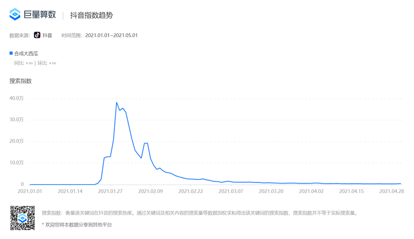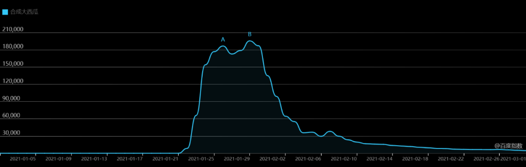 百度指数上,曲线的两个波峰分别对应着1月26日财经媒体对这题游戏爆红现象的报道和解析,以及1月29日,合成大西瓜“外挂”的话题。