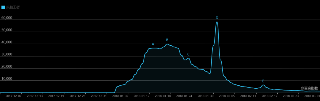 这一热度延续了整个月,在微信平台上,游戏DAU也达到千万级别。1月下旬,游戏热度逐渐下滑,直到1月31日,《头脑王者》由于题库内容违规下架整改,当天游戏指数达到顶峰。