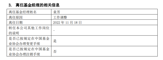 2022年11月18日,基金经理袁芳离任其管理的5只基金产品,包括工银文体产业股票、工银圆丰三年混合、工银圆兴混合、工银科技创新和工银高质量成长。公告显示,其离任原因为工作调整。