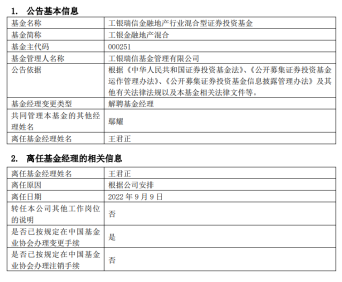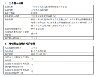 9月23日,王君正离任工银丰盈回报灵活配置混合、工银美丽城镇股票、工银优质成长混合、工银精选平衡混合等四只基金产品,公告则称因个人原因辞职。