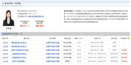 2015年,闫思倩进入工银瑞信,2年后担任基金经理,相继管理了工银生态环境股票A、工银新能源汽车混合A/C两只基金,任职期间分别取得了189.03%、306.25%/297.53%的回报。