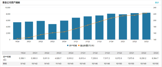 截至2022年三季度末,工银瑞信规模8364.7亿元,150家基金公司中排名第10,在银行系基金中排名首位。