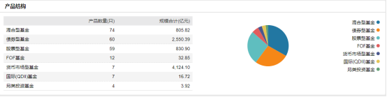 从产品结构来看,7只货币基金规模4124.1亿元,占整体规模近一半。而数量最多的混合型基金,74只产品规模却仅为805.82亿元。此外,股票型基金59只,规模830.9亿元;债券型基金60只,规模2550.39亿元。