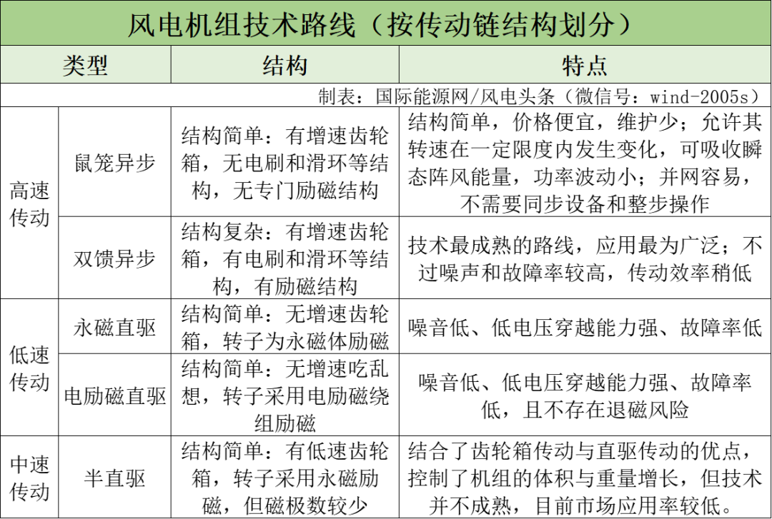风力发电机按照传动链结构划分,可分为高速传动、中速传动和低速传动。高速传动特点是带有增速齿轮箱,分为鼠笼异步和双馈异步,中速传动即半直驱,低速传动又称直驱。