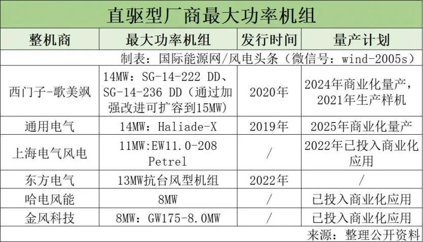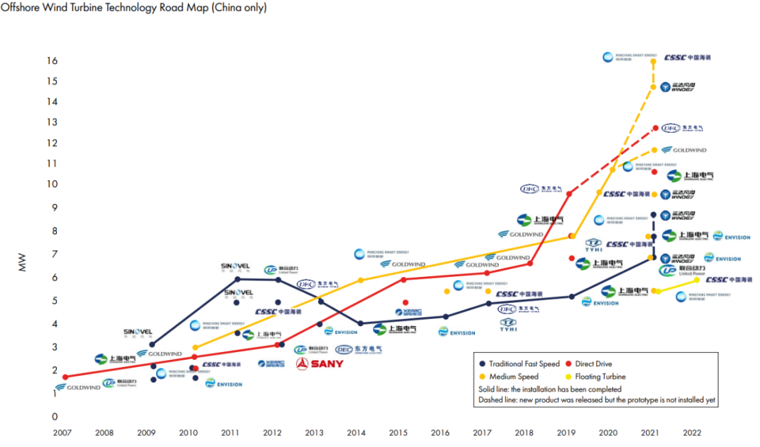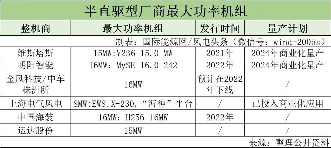 2021年,维斯塔斯成功下线15MW半直驱风机,国内明阳智能、中国海装与金风科技16MW半直驱风机也在2022年先后下线。