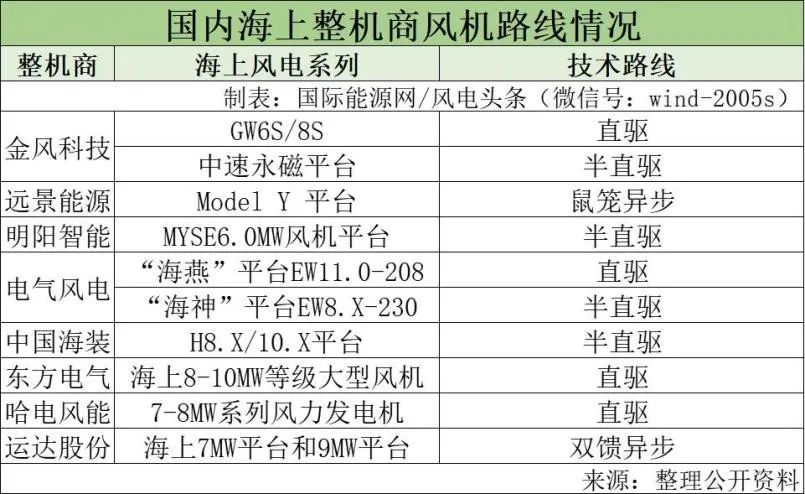 目前国内涉足海上风电的整机厂商包括远景能源、金风科技、明阳智能、电气风电、中国海装、东方电气、哈电风能和运达股份。其中远景能源和运达股份的海上风机还采用增速齿轮箱高速传动技术,中国海装的H5.X/6.X及H8.X/10.X平台部分机型采用高速永磁。其余整机商全部转向直驱或半直驱技术。