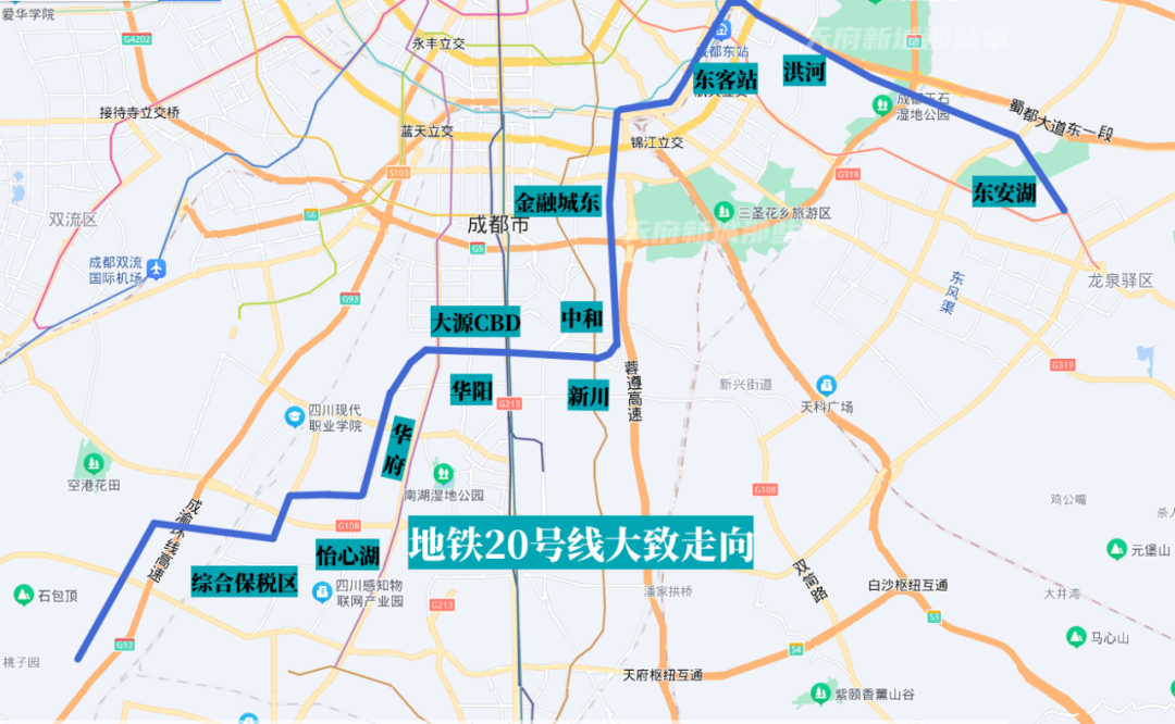 地铁20号线预计将依次途经双流区、高新区、锦江区、成华区以及龙泉驿区,途径东安湖、洪河、成都东站、金融城东、中和、大源CBD、华府、怡心湖等热门板块,同时兼顾南拓和东进发展战略。