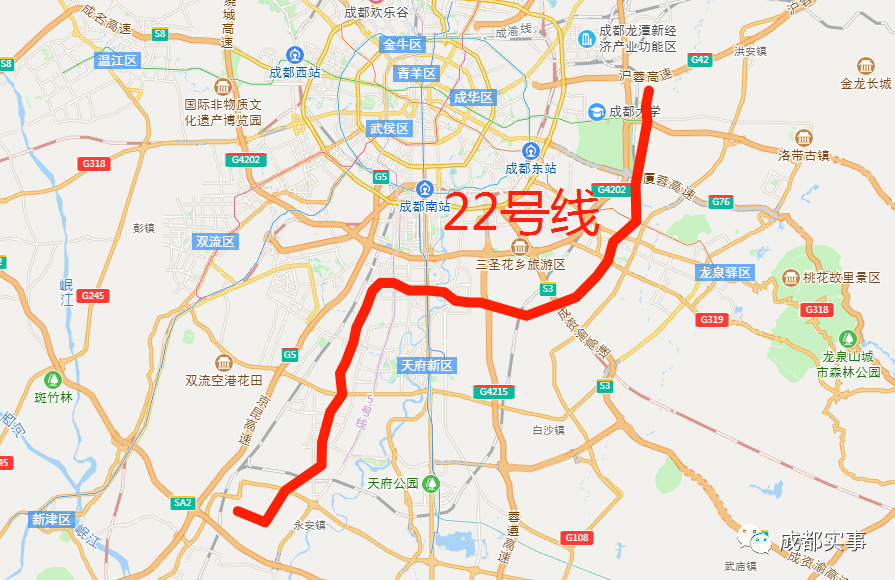 成都地铁22号线预计将起于双流区三官庙附近,止于龙泉驿区西河街道北侧区域附近。途径天府国际生物城、怡心湖板块、大源板块、高新区核心商务区、中和板块、大面板块等近年来几大热门区域。
