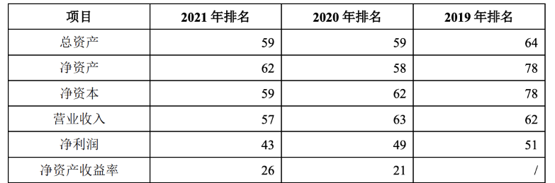 2021年末,首创证券的总资产、净资产、净资本规模行业排名分别为第59位、第62位和第59位。