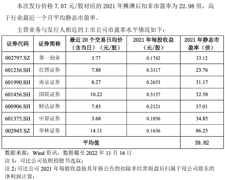 与此同时,首创证券还选择南京证券、红塔证券、国联证券、华林证券等7家上市券商的市盈率情况进行对比,从侧面说明自身发行价及发行市盈率处于合理区间。