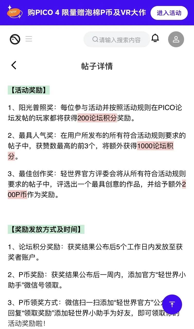 PICO社区论坛里为了刺激用户活跃度,推出了一系列录屏发帖得P币、推荐新人得P币的活动,动辄数百P币(10P币可以抵扣1元)的大额奖励,让用户感受到无限壕气。这给了用户拉动好友体验PICO硬件设备的动力,毕竟使用过程中参与活动获得的大额P币,可以用来抵价换购新的硬件设备。