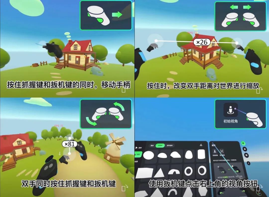 用户在轻世界里移动的操作逻辑与Horizon Worlds也大体一样,都是需要用手柄选择将要到达的地点,点击即可完成瞬移(也可在设置改为滑行移动)。这样的玩法让用户在VR环境里,能够保证沉浸式空间感的同时,体验到更好的掌控感。