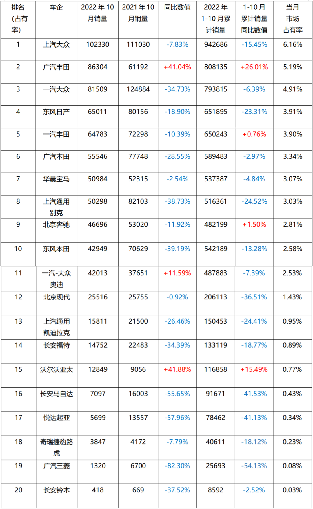 其中,国产品牌并没有出现大幅下降,比如吉利汽车10月总销152263辆,同比增长36%,其中新能源销量暴涨;长城汽车10月总销量217816辆,同比大涨169%;而长城汽车虽然出现了一定下滑,其10月总销量10.02万辆,同比减少了10.58%,没有出现大溃败的情况。