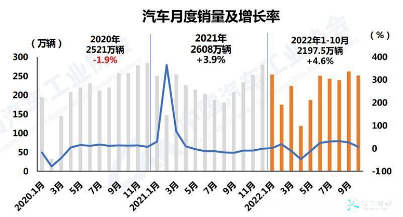 根据中汽协2022年11月10日公布的最新产销数据来看:2022年10月,我国汽车市场共售出250.5万辆新车。同比增长6.9%,今年1-10月,市场累计销量达到2197.5万辆,同比增长4.6%。