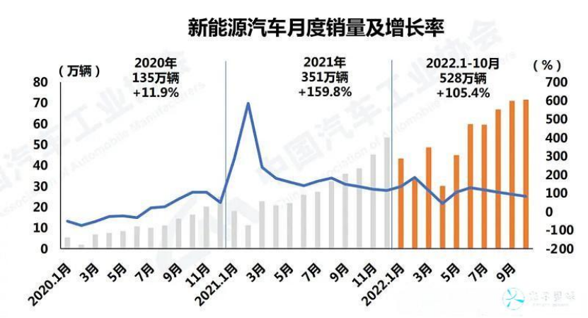 2022前三季度我国新能源乘用车市场销量为435.1万辆,市场渗透率增至25.7%。仅在乘用车市场,新能源汽车的市场渗透率就已经实现并且超过了当时预期到2025年,新能源汽车新车销量占比达到20%左右的目标,而这一切还是在疫情反复、芯片短缺、原材料上涨等因素影响的背景下。