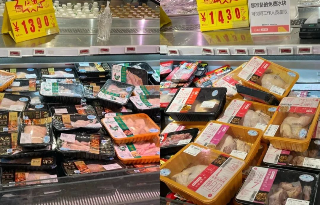 价格的变动可能是其中一个原因。盒马奥莱店商品的价格不是固定的,有时候一天几变,甚至来不及贴价签。结账台旁,往往会张贴着提示“散称肉禽类、水果、蔬菜以结账价格为准”。