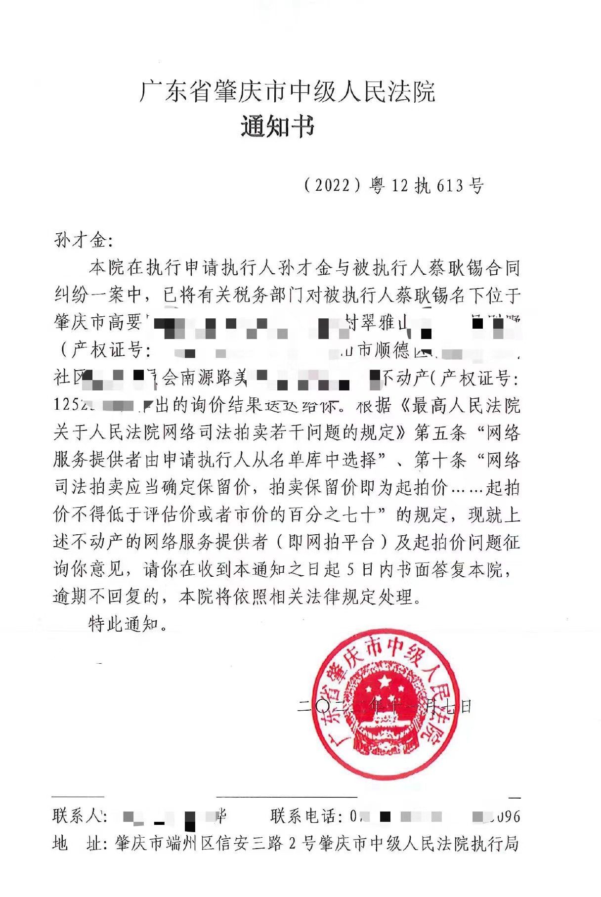 11月7号,广东省肇庆市中级人民法院发布的通知书显示,有关部门已开始对蔡耿锡的财产进行强制执行。