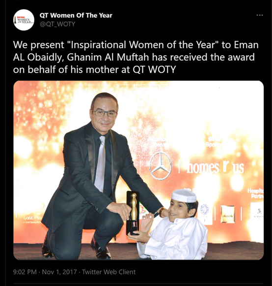 卡塔尔媒体「今日卡塔尔(Qatar Today)」五年前发布的一条推特显示,由于慈善事业上的成就,加宁的母亲伊曼获得了那一年的「年度励志女性(Inspirational Women of the Year)」称号。在现场颁奖的照片中,母亲伊曼并没有入镜,而是选择让年幼的儿子加宁代为领奖。