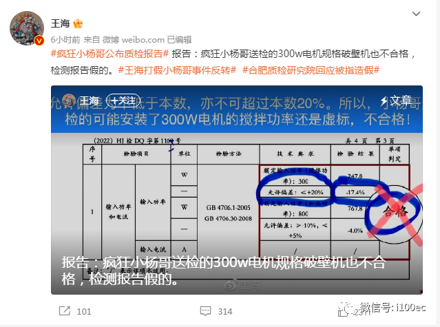 此外,王海又在今日发布了一条微博,质疑疯狂小杨哥送检的300w电机规格破壁机不合格,检测报告假的。据悉,王海发出了三个举报,第一举疯狂小杨哥直播带货金正破壁机时涉嫌未尽责选品并且利用虚假检测报告欺骗公众;第二举报“威凯认证检测有限公司”涉嫌虚假认证;第三举报合肥产品质量监督检验研究院涉嫌出具不实、虚假报告。