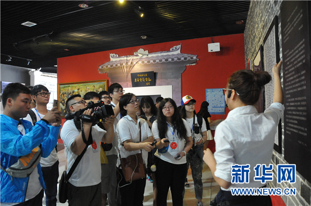 解说员向“长征路上奔小康”大型主题活动采访团记者介绍黎平会议情况。新华网 周远钢 摄