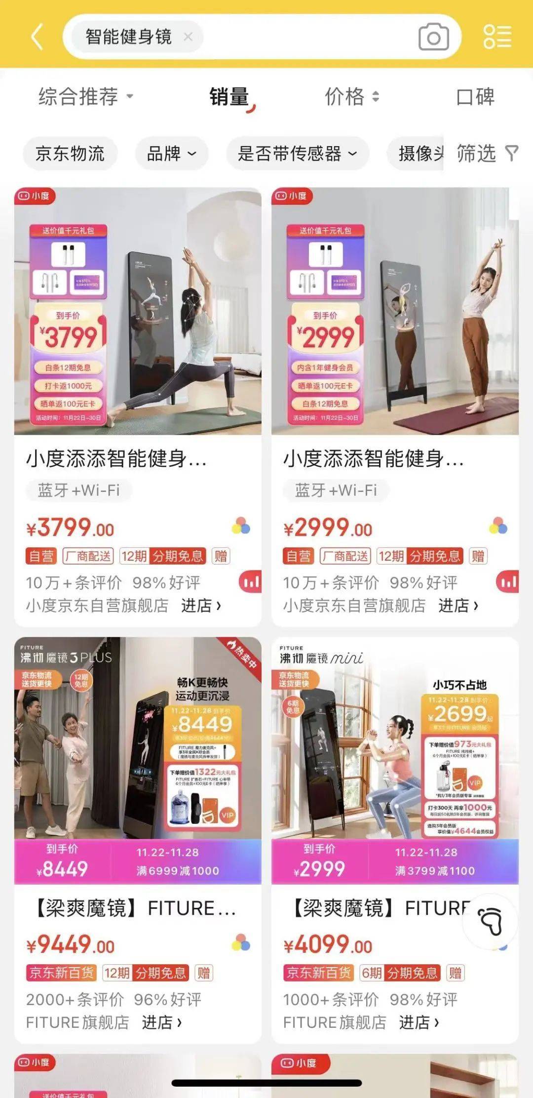在京东上,销量排名前三的都是小度添添健身镜系列产品,第一个吃螃蟹的FITURE魔镜在京东平台上的销量位居第四。记者注意到,3000元左右健身镜销量较高,8000元以上的健身镜基本无人问津。