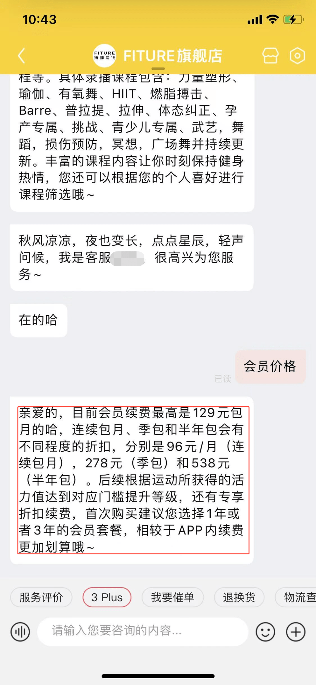 目前,智能健身镜企业基本都采用了“硬件销售+付费订阅”的商业模式。FITURE京东自营旗舰店客服人员告诉《IT时报》记者,目前会员续费最高是129元/月,如果连续包月、季包、半年包等会更便宜一点,半年包为538元。由此看来,一年的会员续费基本在1000元左右。客服建议,在购买硬件时选择时间更长的会员套餐更划算。