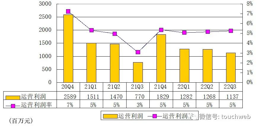 唯品会2022年第三季度运营利润为11亿元(约1.6亿美元),较上年同期的7.7亿元增长47.6%;运营利润率为5.3%,上年同期的运营利润率为3.1%。