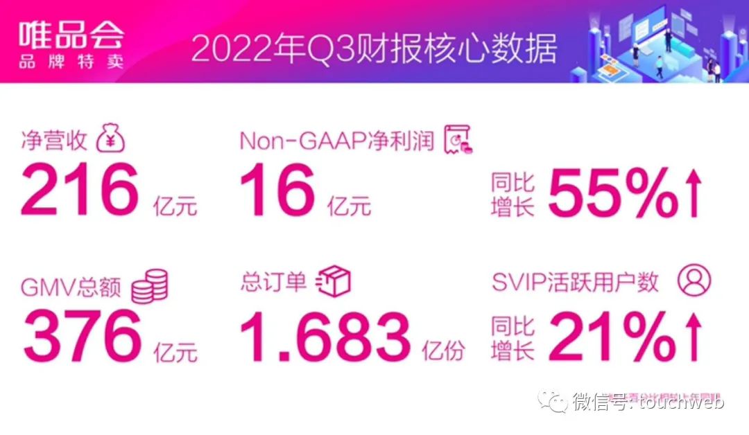 唯品会2022年第三季度Non-GAAP净利润16亿元,同比增长55%;超级VIP活跃用户数同比增长21%,对线上净GMV贡献占比达40%。