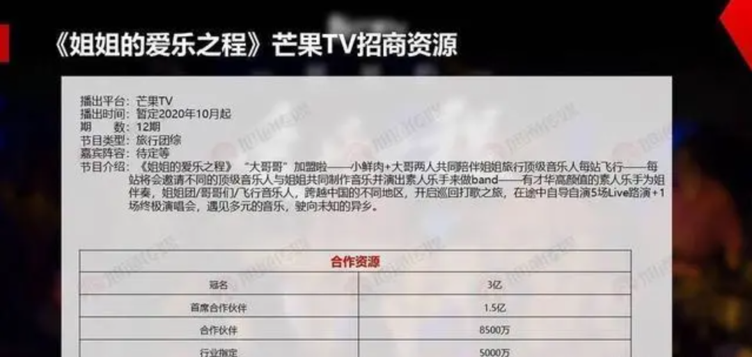 据此前媒体曝光数据,当时浪姐团综的冠名费达3亿元,首席合作伙伴1.5亿,合作伙伴8500万,行业指定5000万,最终《姐姐的爱乐之程》达到了9个赞助商,招商金额让芒果尝到了实实在在的甜头。