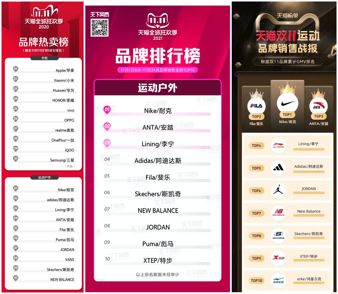 从天猫电商平台近三年发布的双11大促品牌热卖榜单来看,其数据也已暗合了这一趋势。2020年阿迪达斯虽然营收下降,但这一年的排名还是仅次于第一名的耐克,位居李宁、安踏之前。而到了2021年,阿迪达斯被李宁、安踏赶超,跌出了前三,排名第四。再到今年,连续两年排名第五的斐乐一举跃居第二,阿迪达斯勉强保住了第五名,二者戏剧性地与2020年的排名做了一个“对调”。